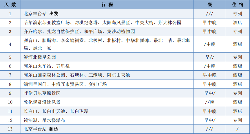 北京出发一路向北旅游专列:从北京出发,途经哈尔滨、长白山、呼伦贝尔、满洲里等地,最终抵达漠河。可领略东北地区的风光和草原美景,参观太阳岛风景区,扎龙自然保护区,长白山天池、呼伦贝尔大草原、满洲里国门等景点。